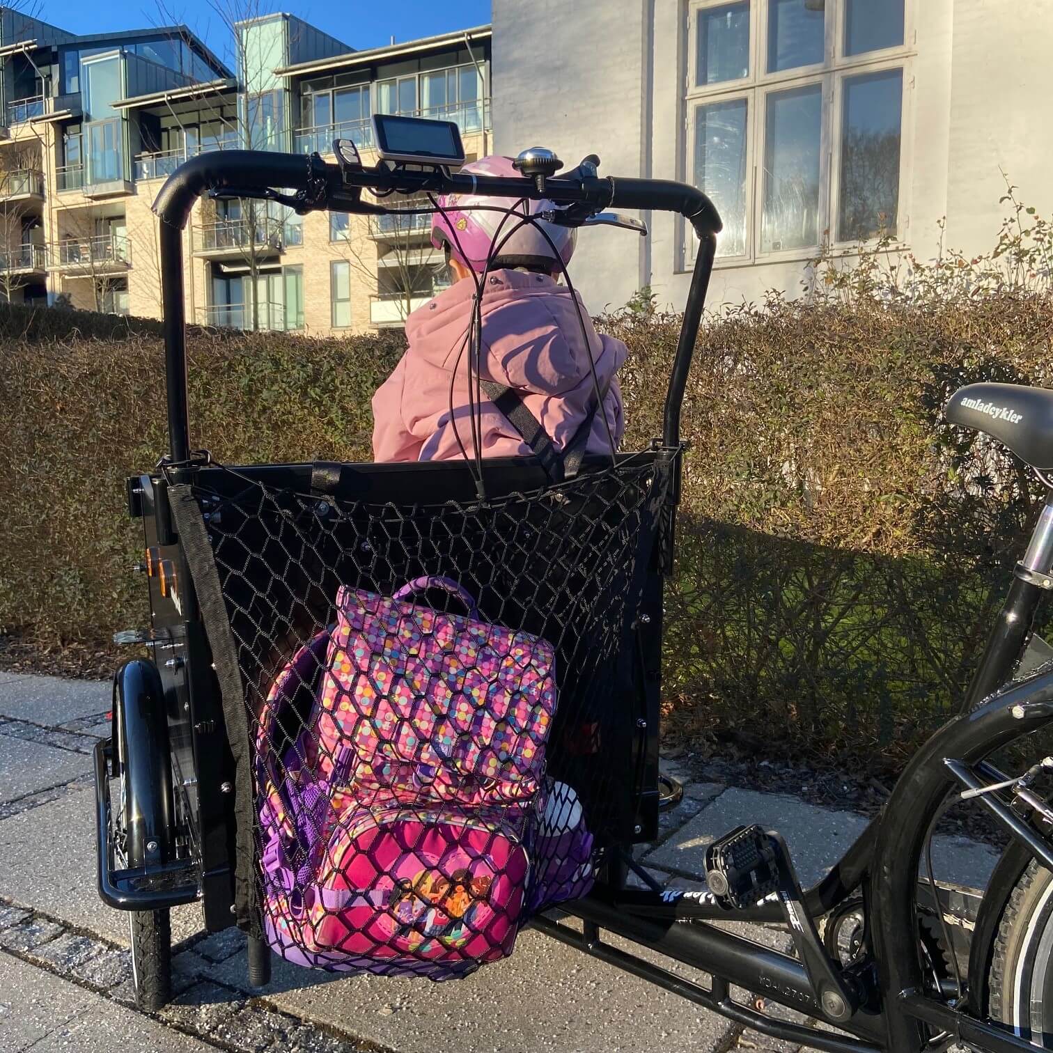 Net for cargo bike. Don’t let your things float around in the cargo bike, with this strong and super smart net / luggage net. The storage net is attached, via the integrated hooks located in each corner, to the back or front of the cargo bike box. The net can be used both as a single or a double net.